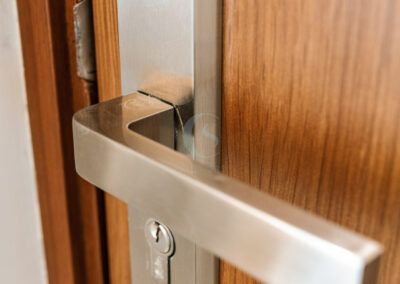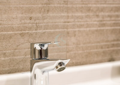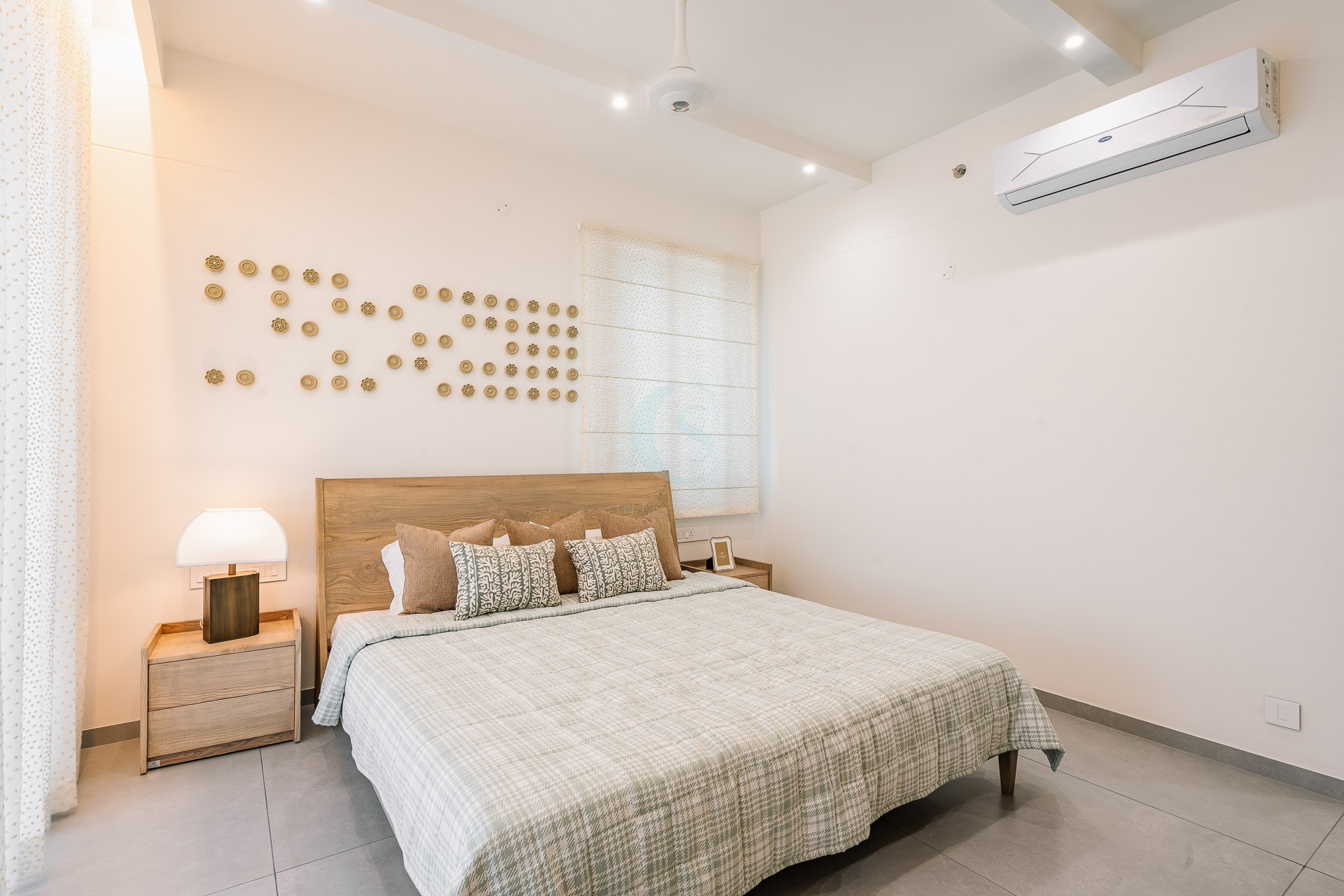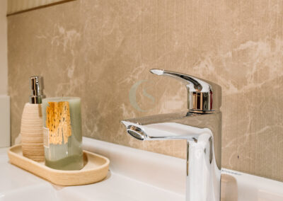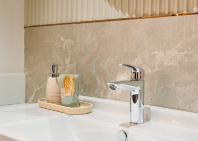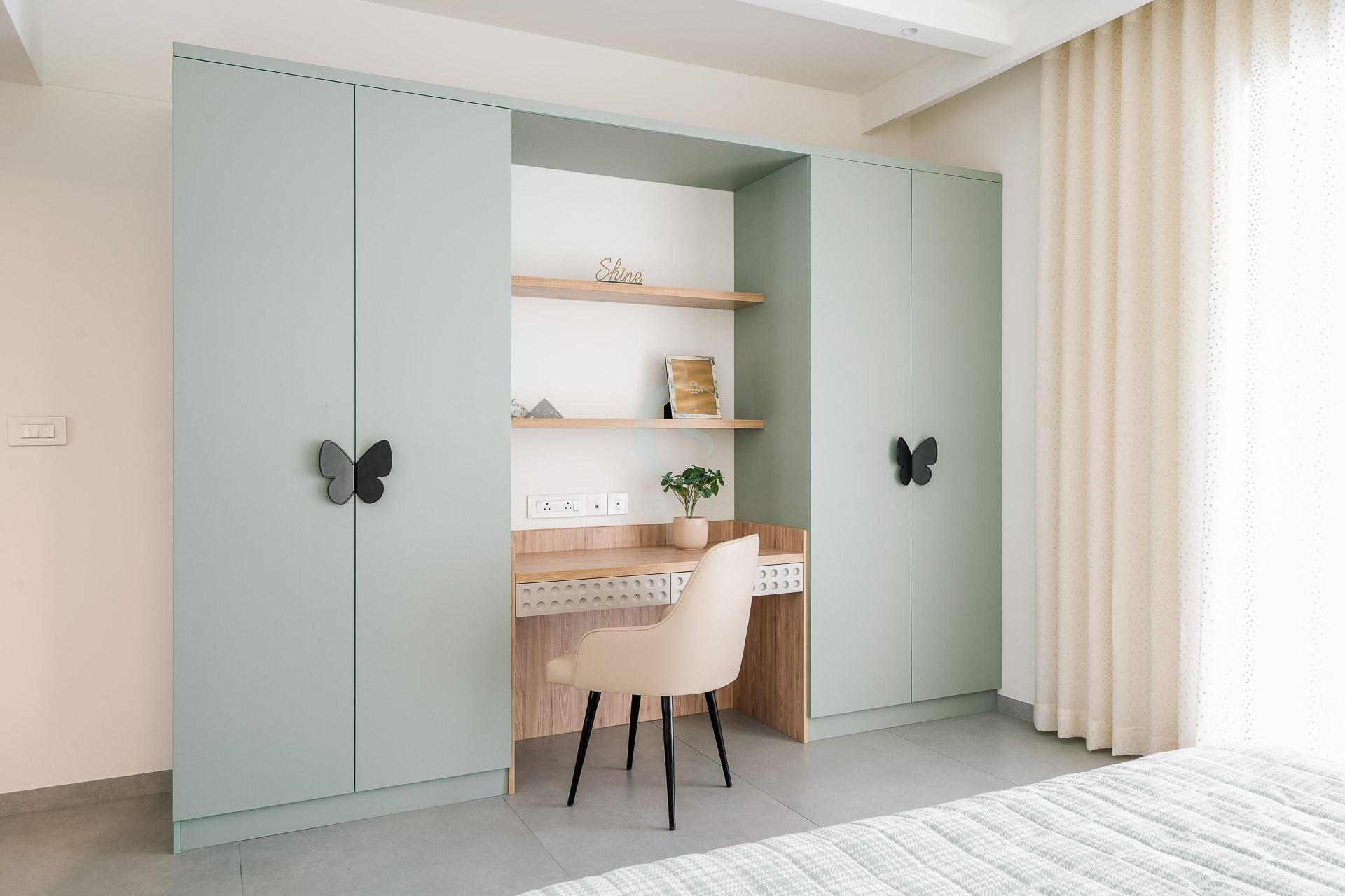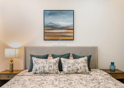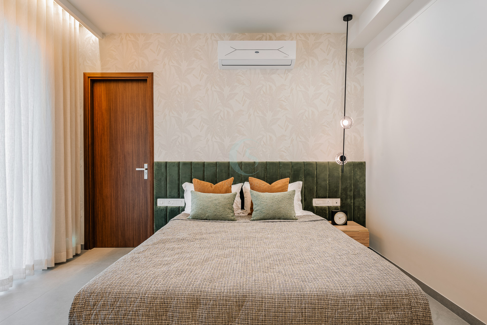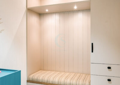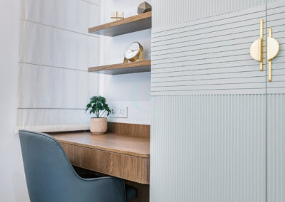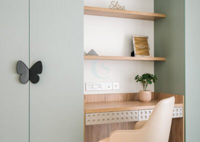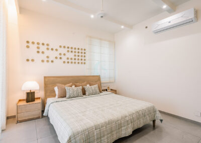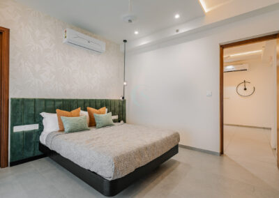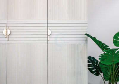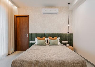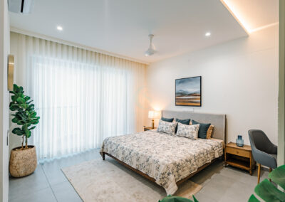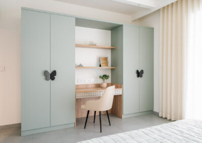 Each bedroom carries its own identity while maintaining the cohesive modern tone. The guest bedroom plays with striking contrasts in black and white, highlighted by stenciled wallpaper. The kids’ bedroom is playful and creative, featuring a custom CNC-cut art wall, butterfly handles, and a polished bed finish. The master bedroom exudes refined luxury with custom blue and gray bedspreads, a simple grounding carpet, and brass accents for an elevated touch.