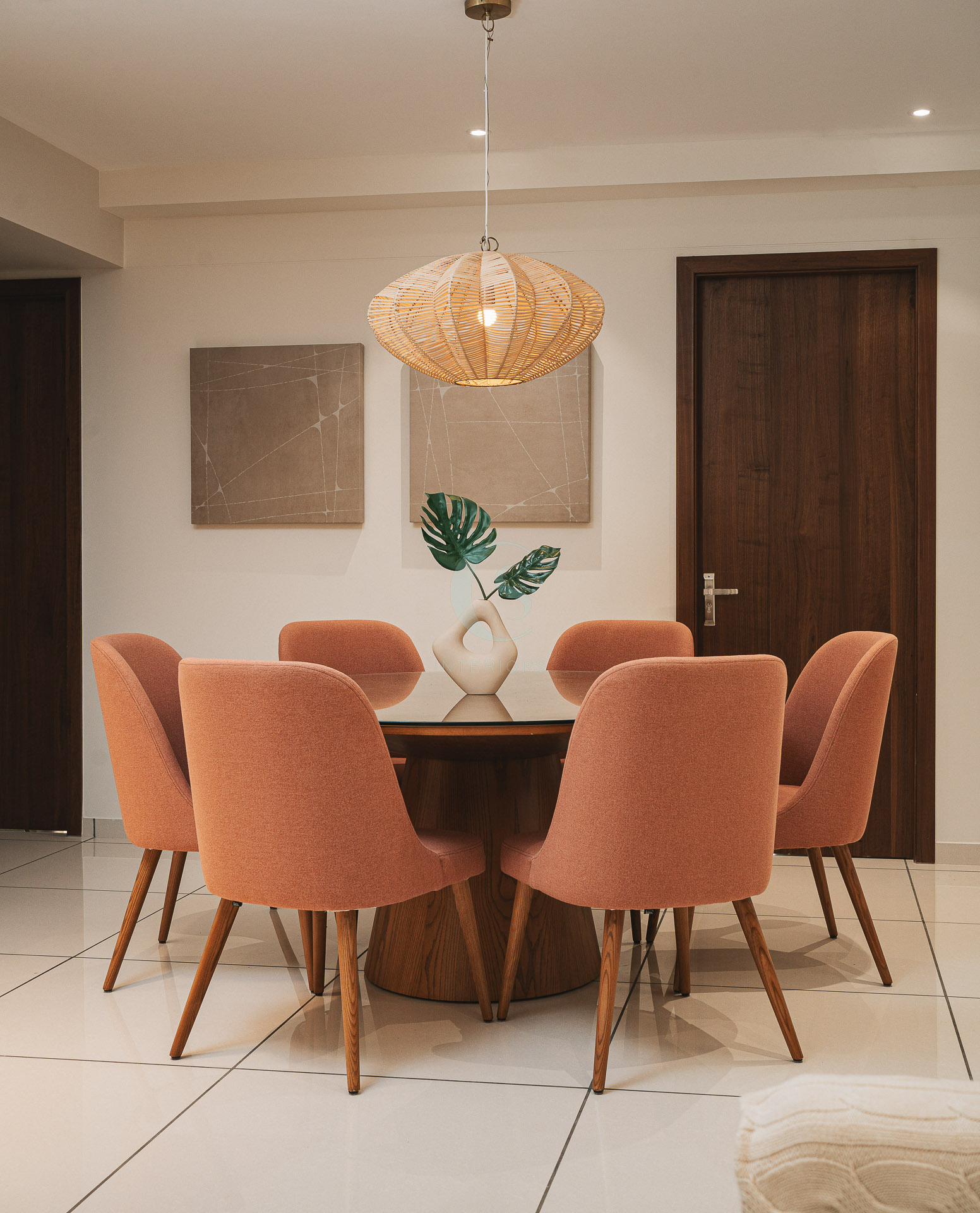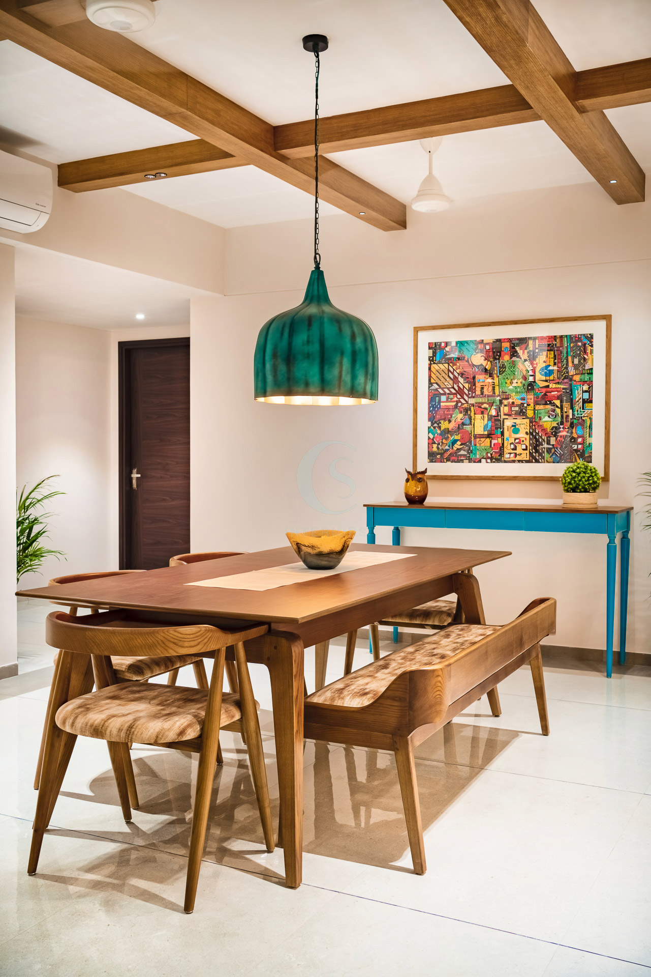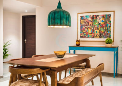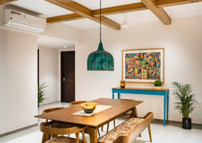 The Puja area, featuring classic Tanjore paintings, flows gracefully into the dining space, where vibrant console accents breathe warmth and energy.