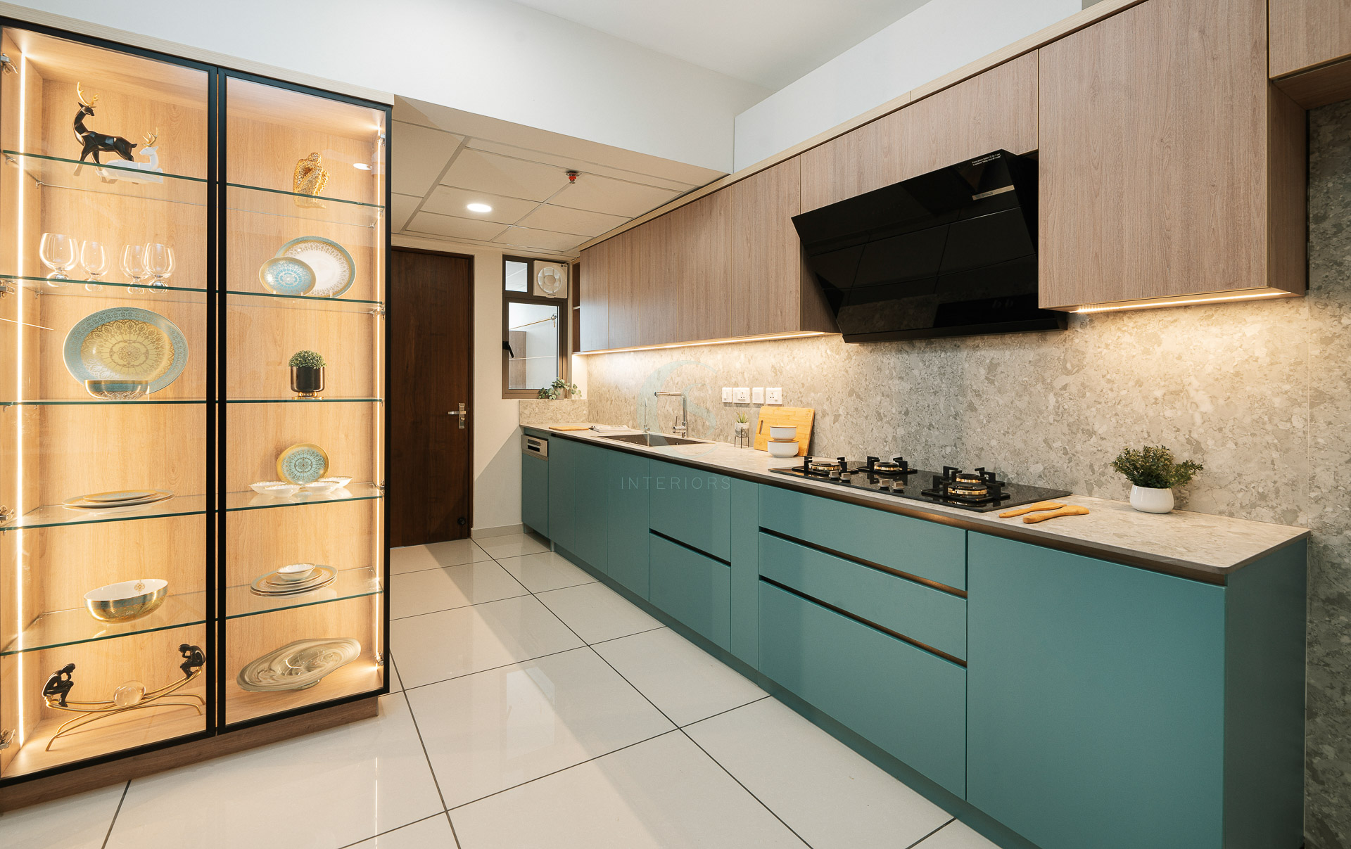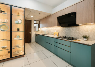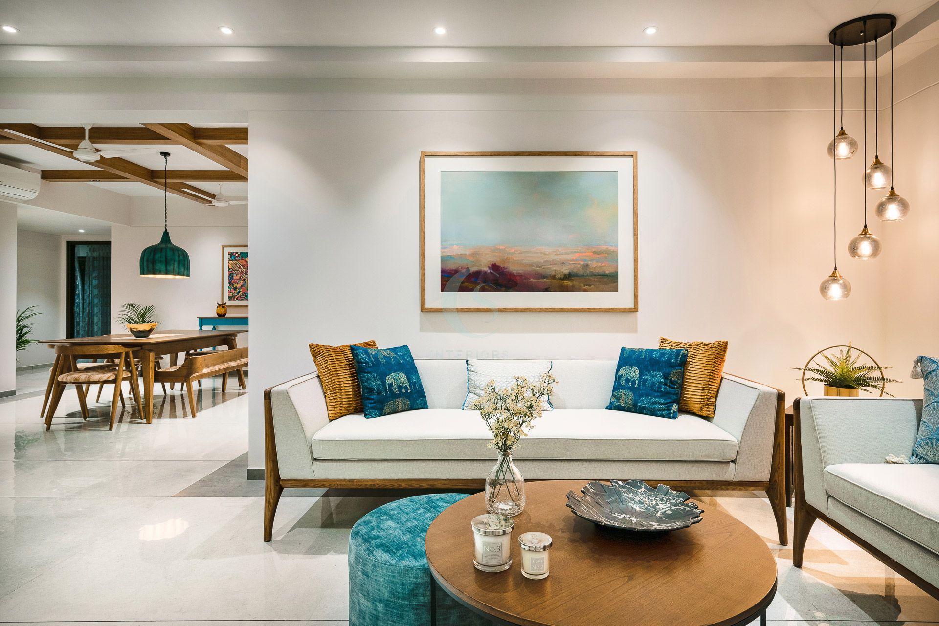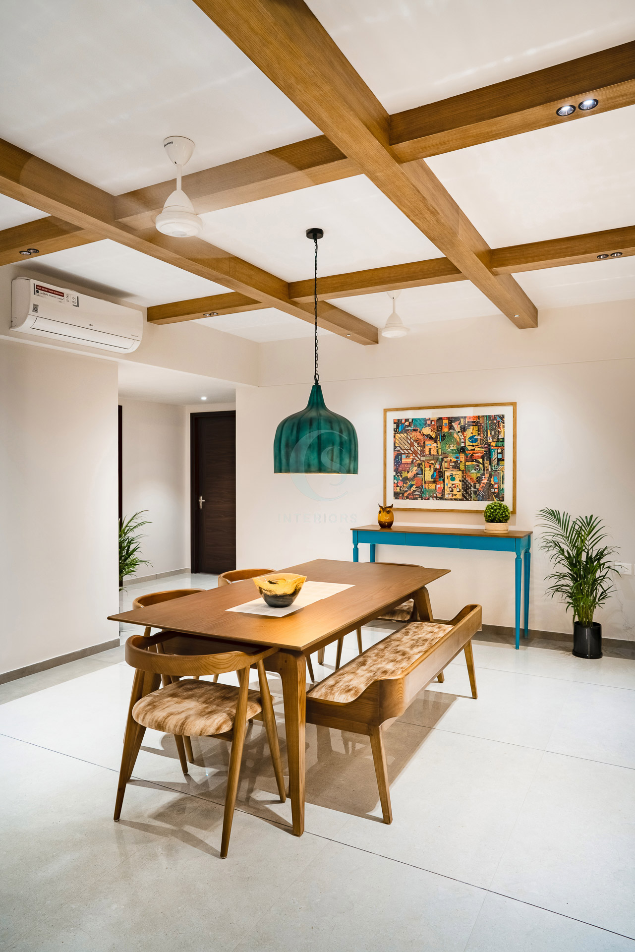 The Puja area, featuring classic Tanjore paintings, flows gracefully into the dining space, where vibrant console accents breathe warmth and energy.