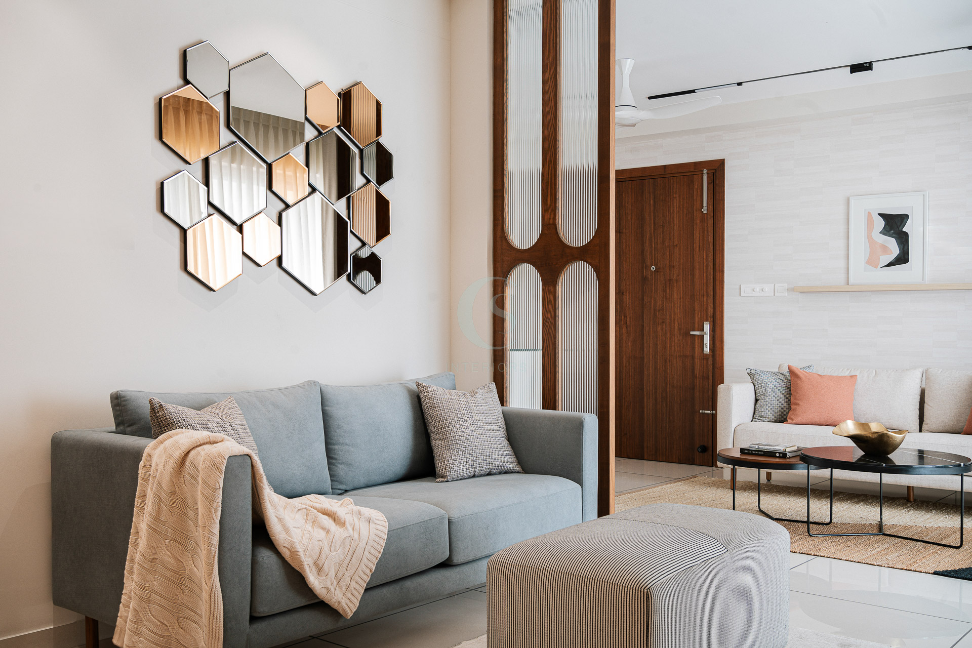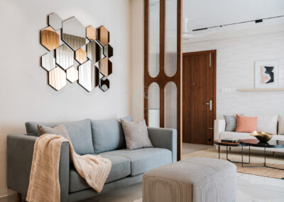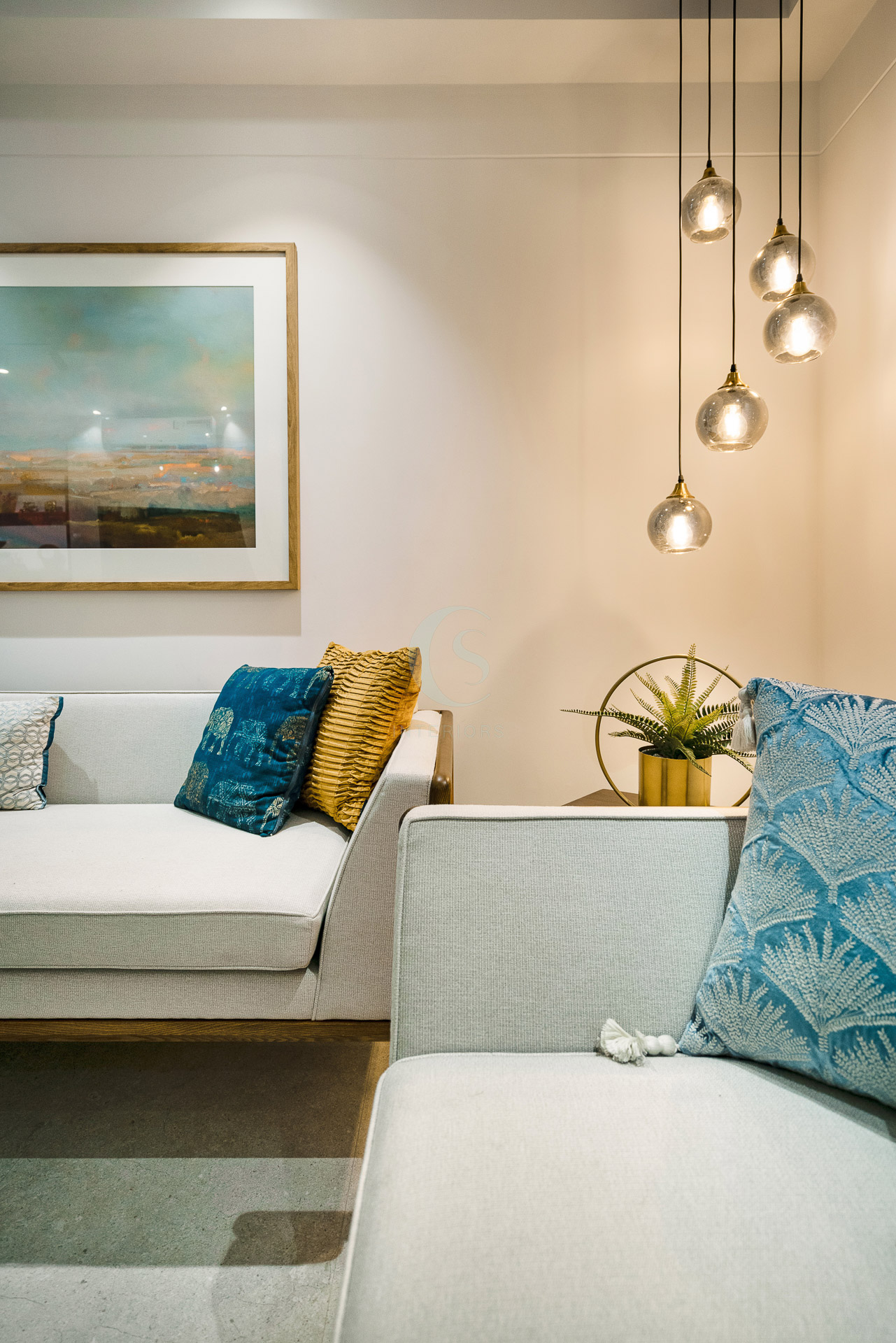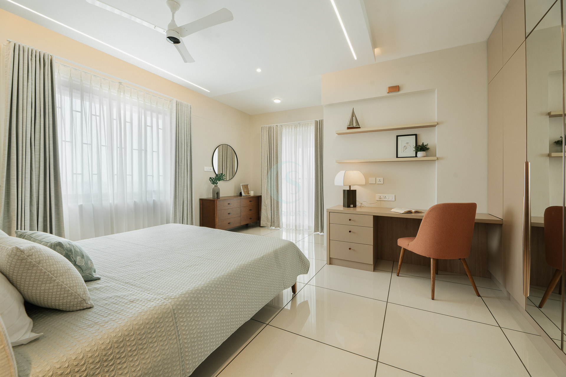 Subtle cultural nods appear in the form of elephant imprints on cushions and a TV bench, celebrating Tamil heritage while grounding the home in tradition.
