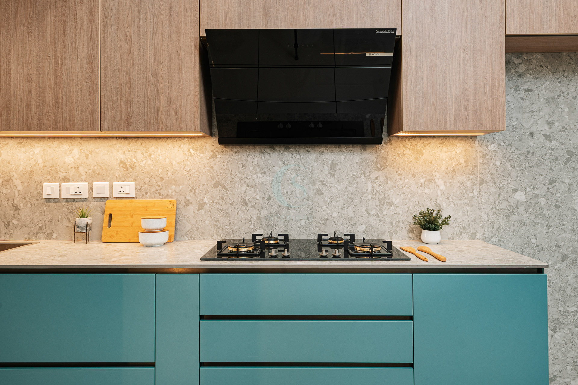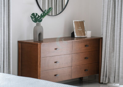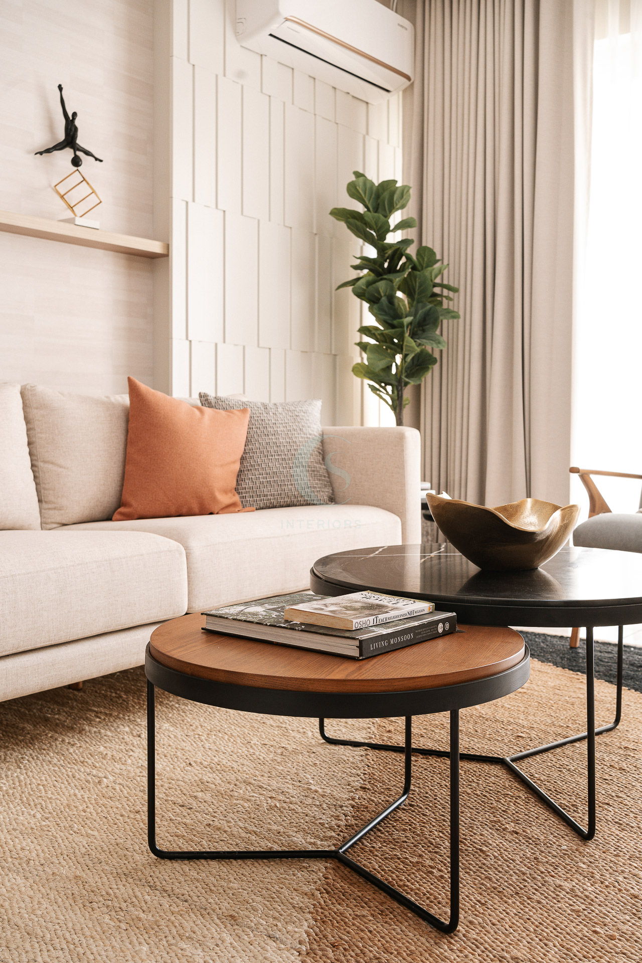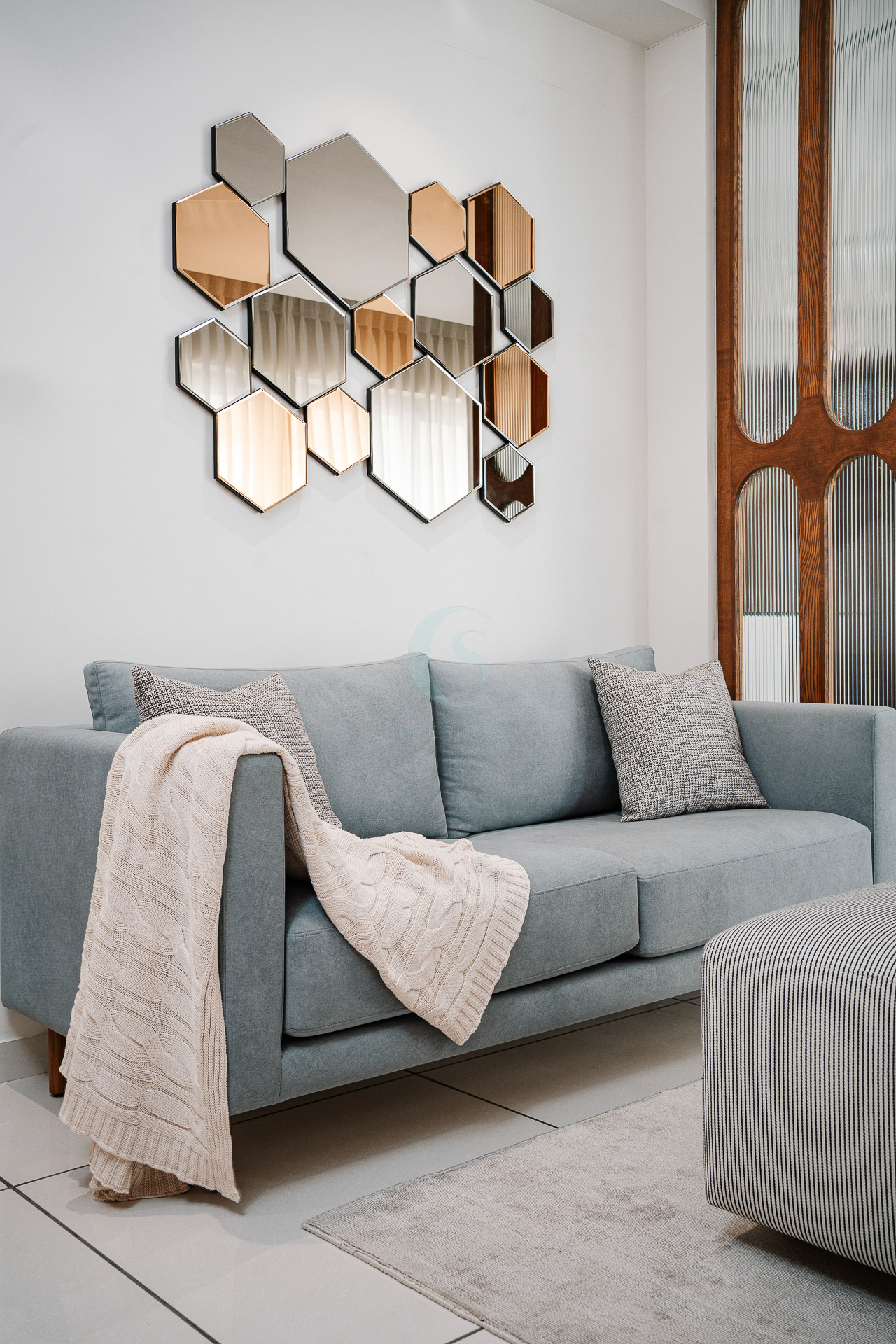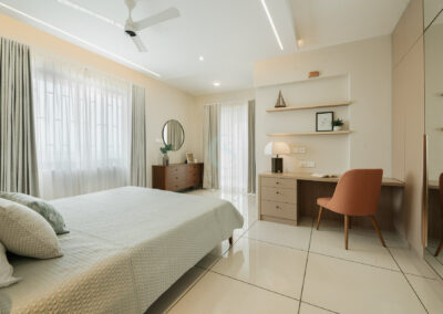 Subtle cultural nods appear in the form of elephant imprints on cushions and a TV bench, celebrating Tamil heritage while grounding the home in tradition.