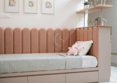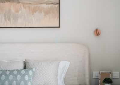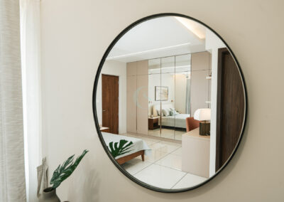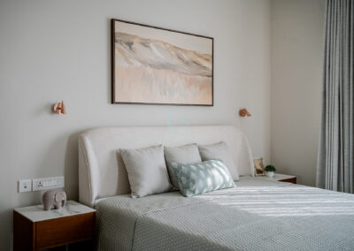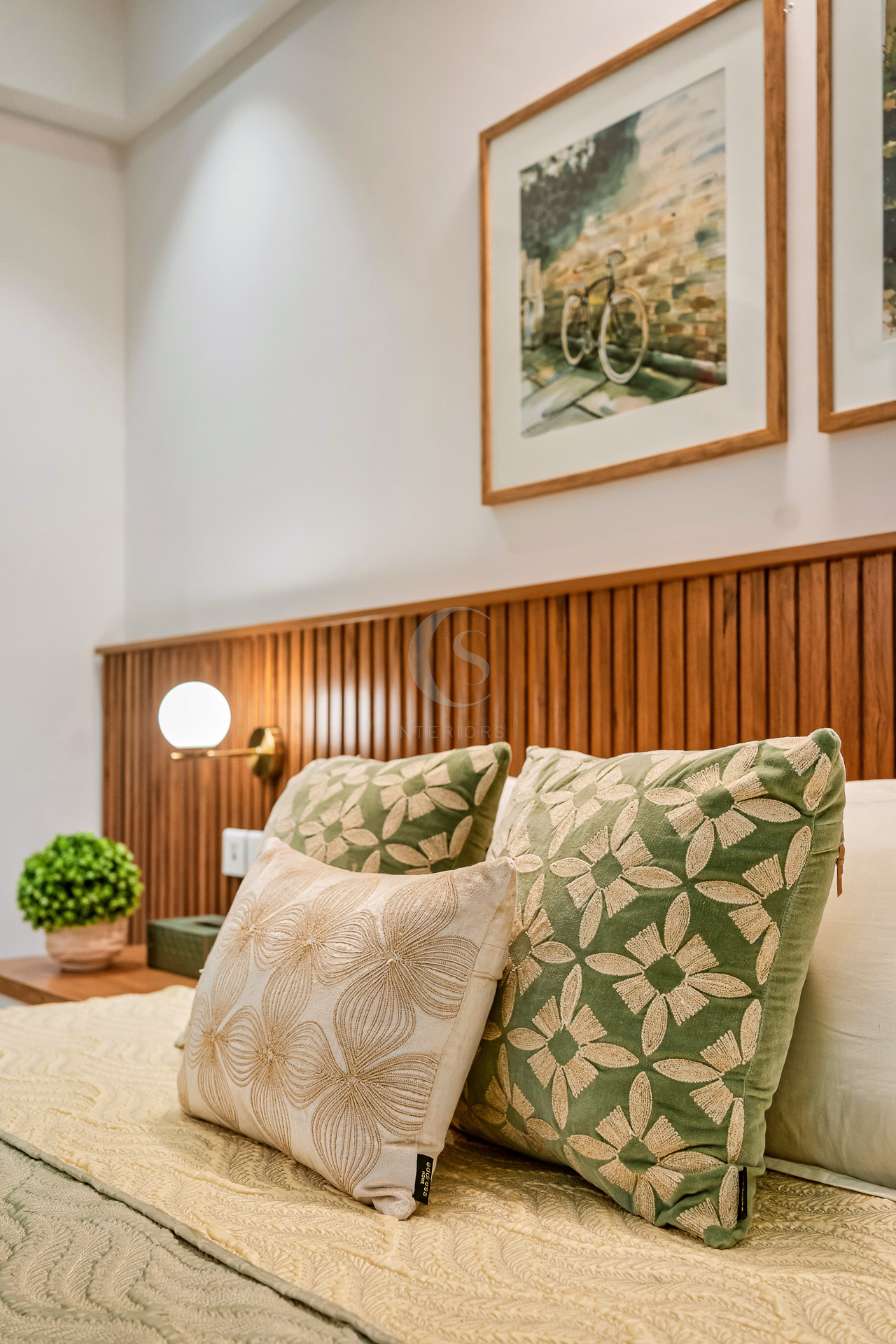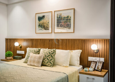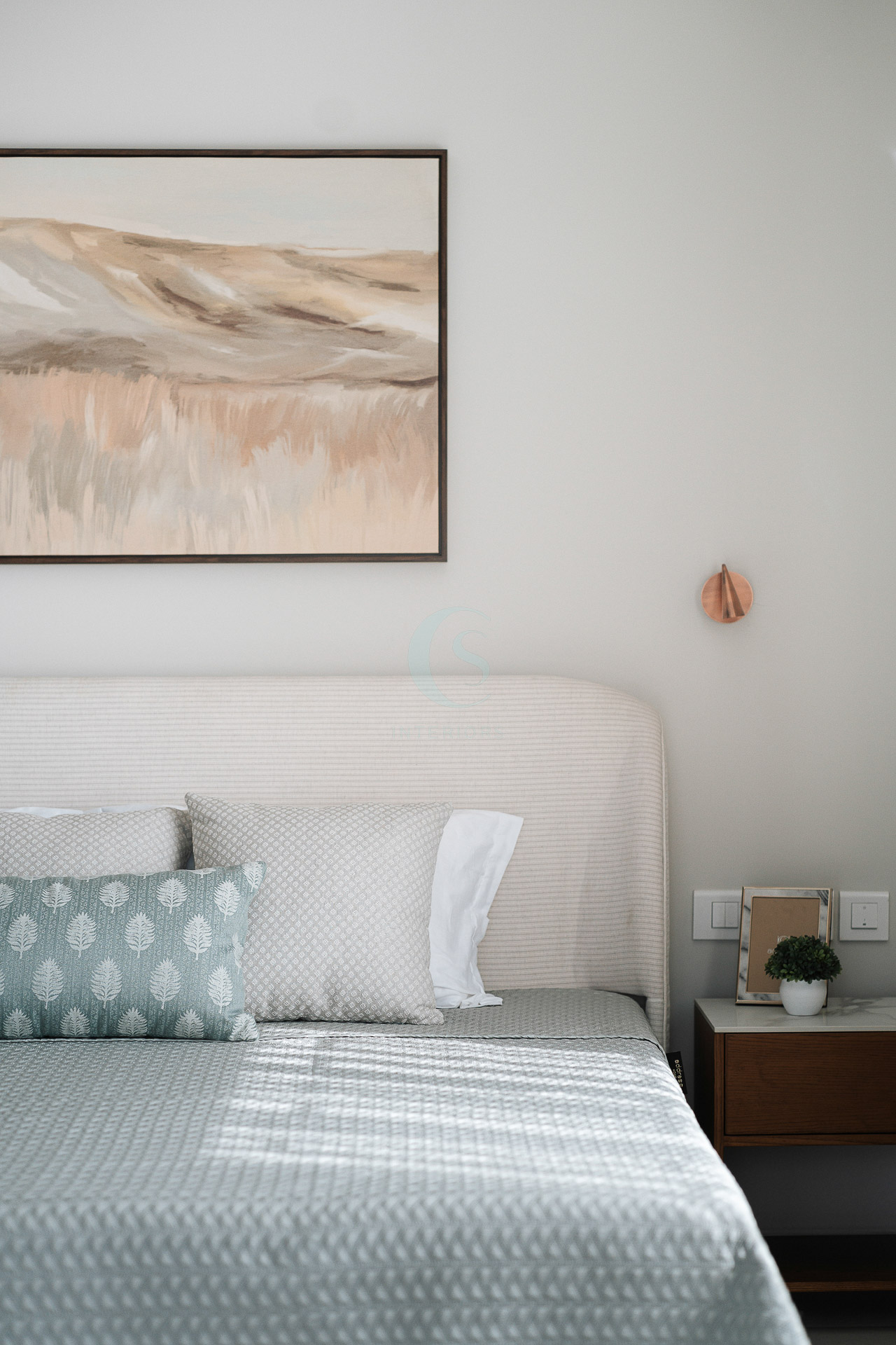 Personalization played a key role across the three bedrooms, each carrying artworks that narrate the couple’s journey. The most memorable element is a cycle-themed painting above the master bed, symbolizing their first meeting on a cycling expedition — a deeply personal touch that makes the design truly theirs.