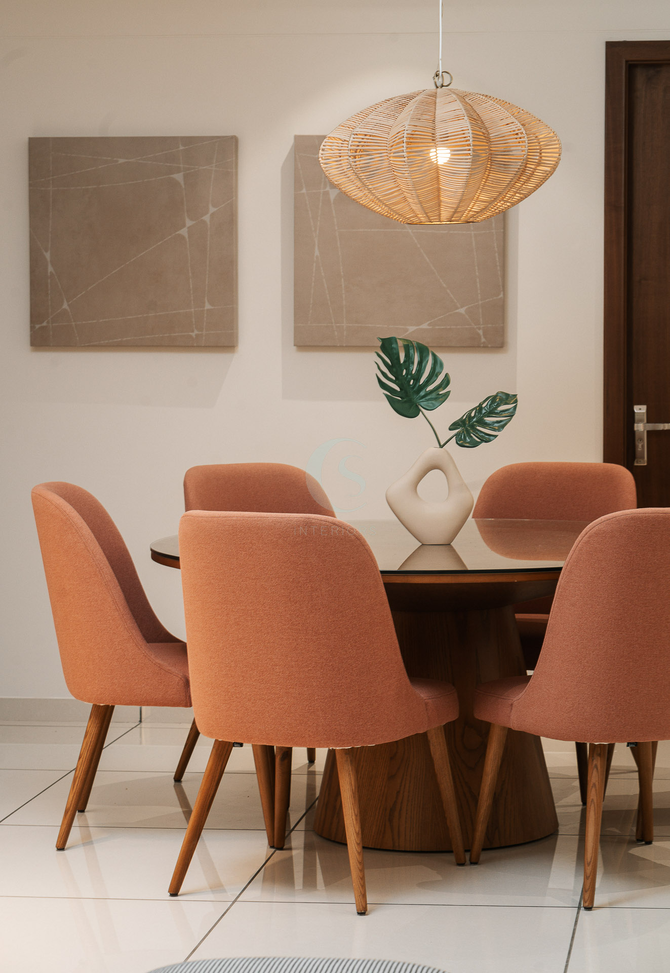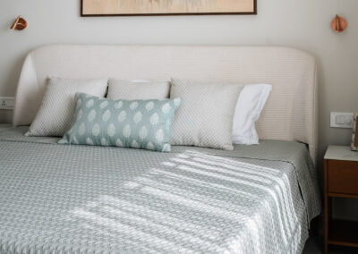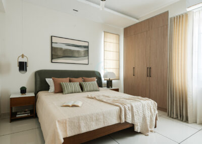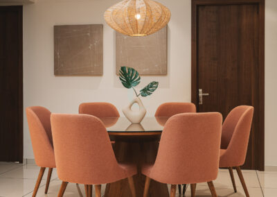 The master bedroom and other spaces were styled with restraint, maintaining a minimal and breathable aesthetic. In the dining area, the challenge was to fit an 8-seater within a limited footprint. Our solution was a round dining table, which not only optimized space but also enhanced comfort and flow.