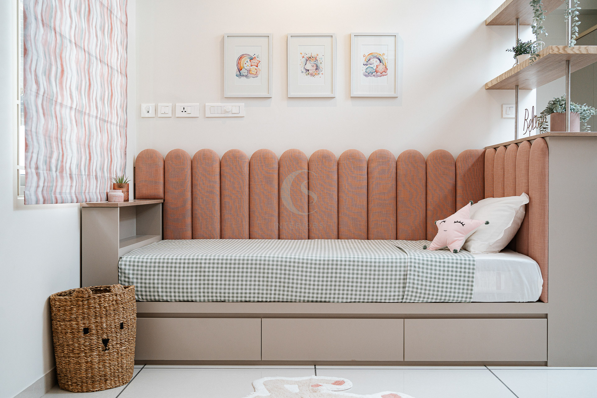 By reworking the plan, we tucked the bed into a corner and restructured electrical placements to ensure proper ventilation. This resulted in a cozy single-bed setup that maximized open play space — a blend of creativity and practicality.